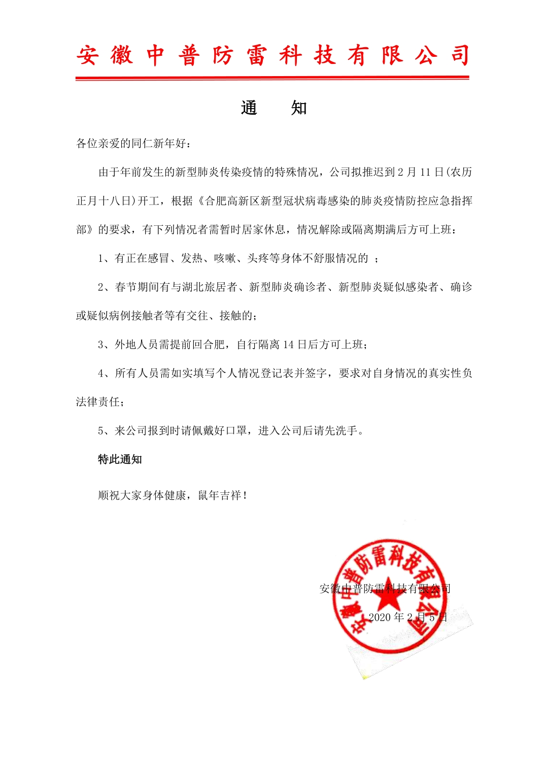 安徽中普防雷“關于2020年春節(jié)放假通知”