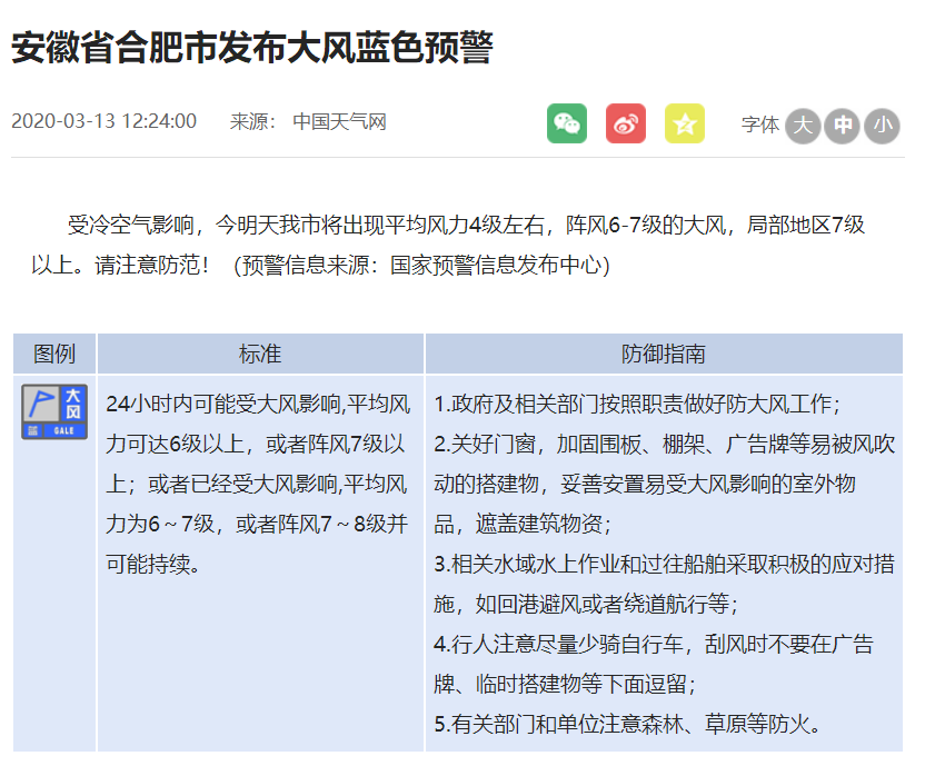 24小時內(nèi)可能受大風影響,平均風力可達6級以上,或者陣風7級以上;或者已經(jīng)受大風影響,平均風力為6~7級,或者陣風7~8級并可能持續(xù)。